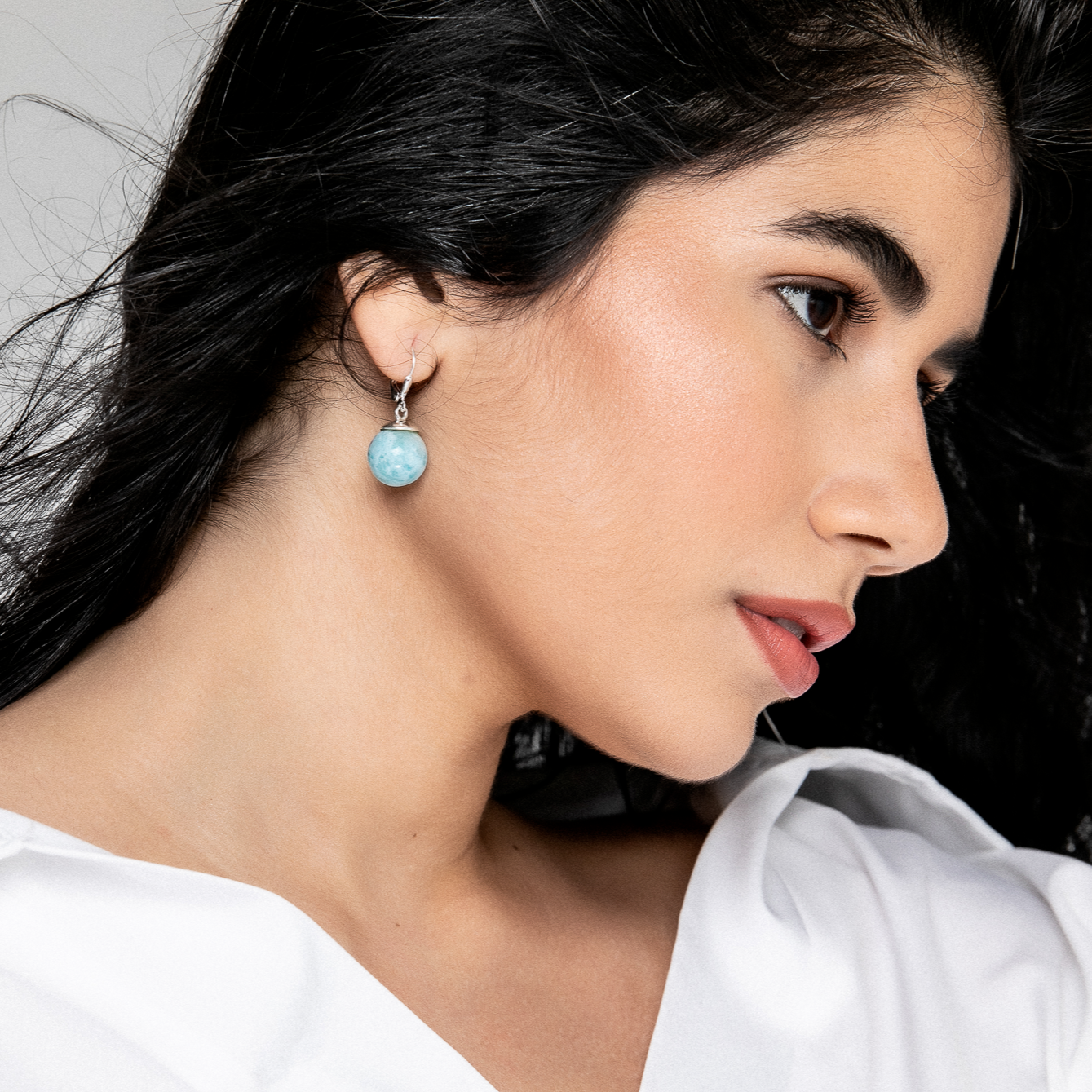 The stunning blue shades of the round Larimar beads are beautifully complemented by the silver hooks, creating a timeless and classic look.  Elevate any outfit and show off your unique personality with these vibrant Cecile earrings.