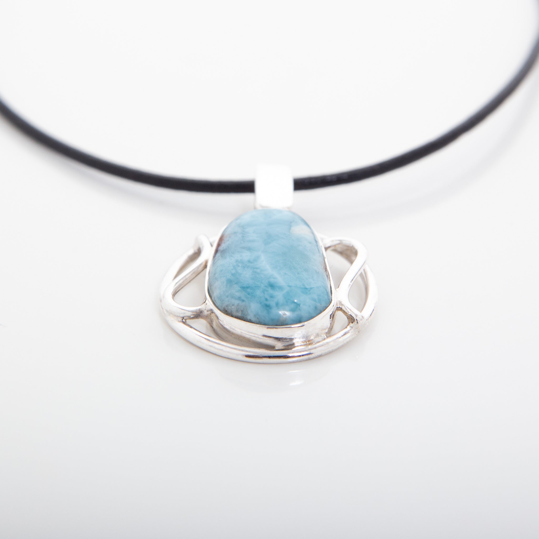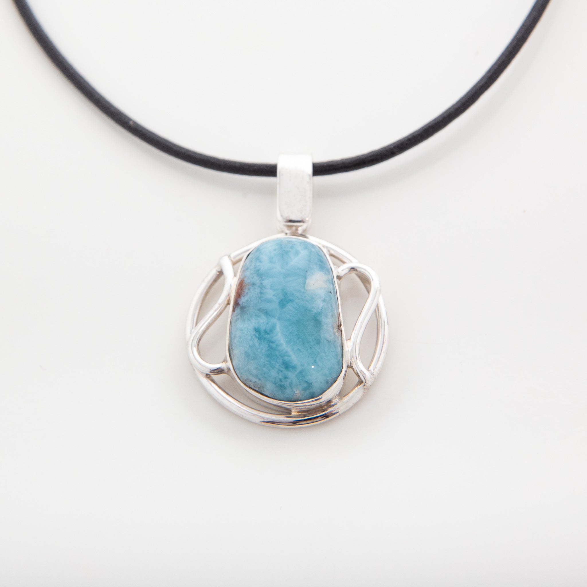 Stand out with this one-of-a-kind Larimar Pendant Baruch! The blue Larimar stone has a naturally formed with a striking red spot created by copper. Handmade with a unique silver string, this pendant is sure to catch eyes and bring a touch of quirkiness to your style.
