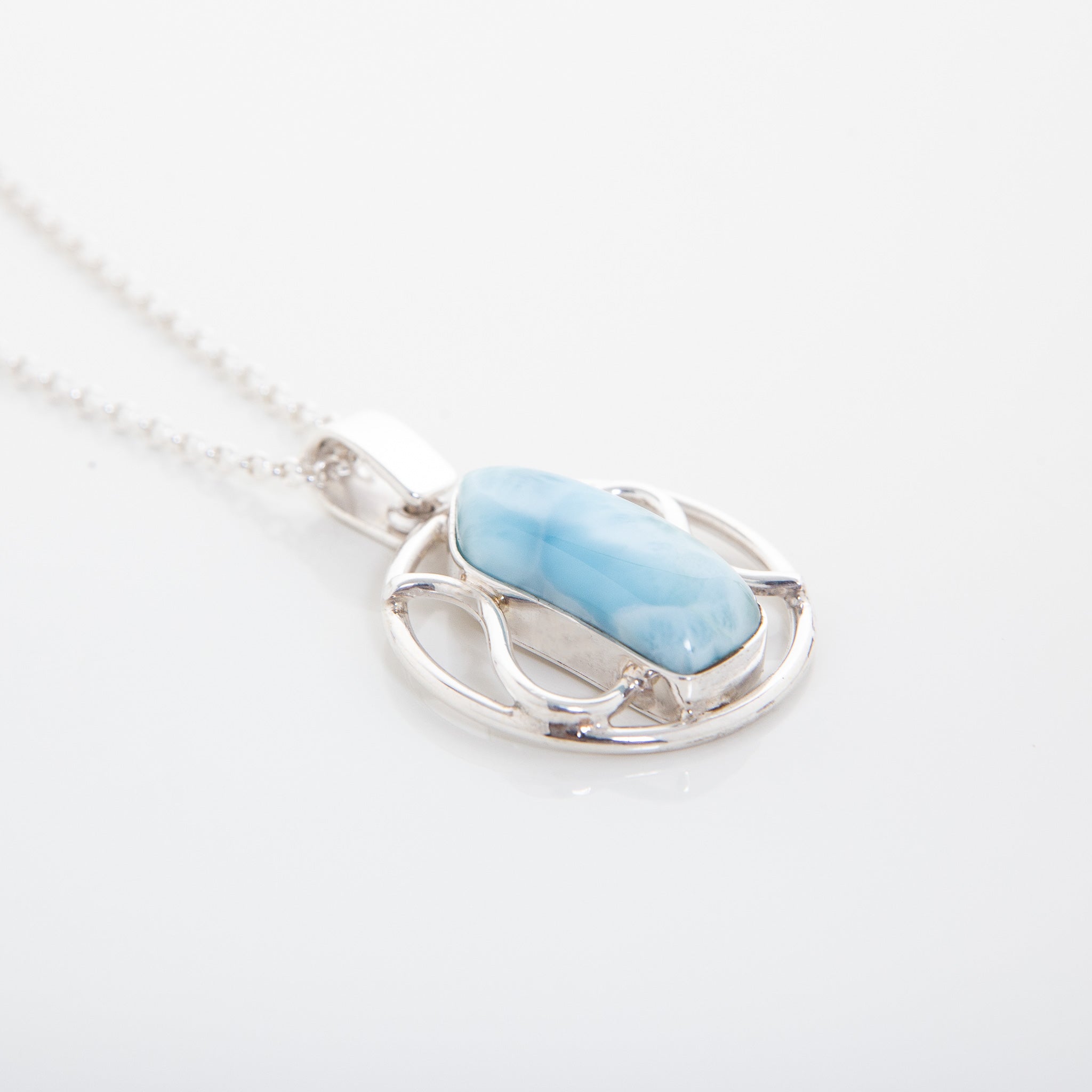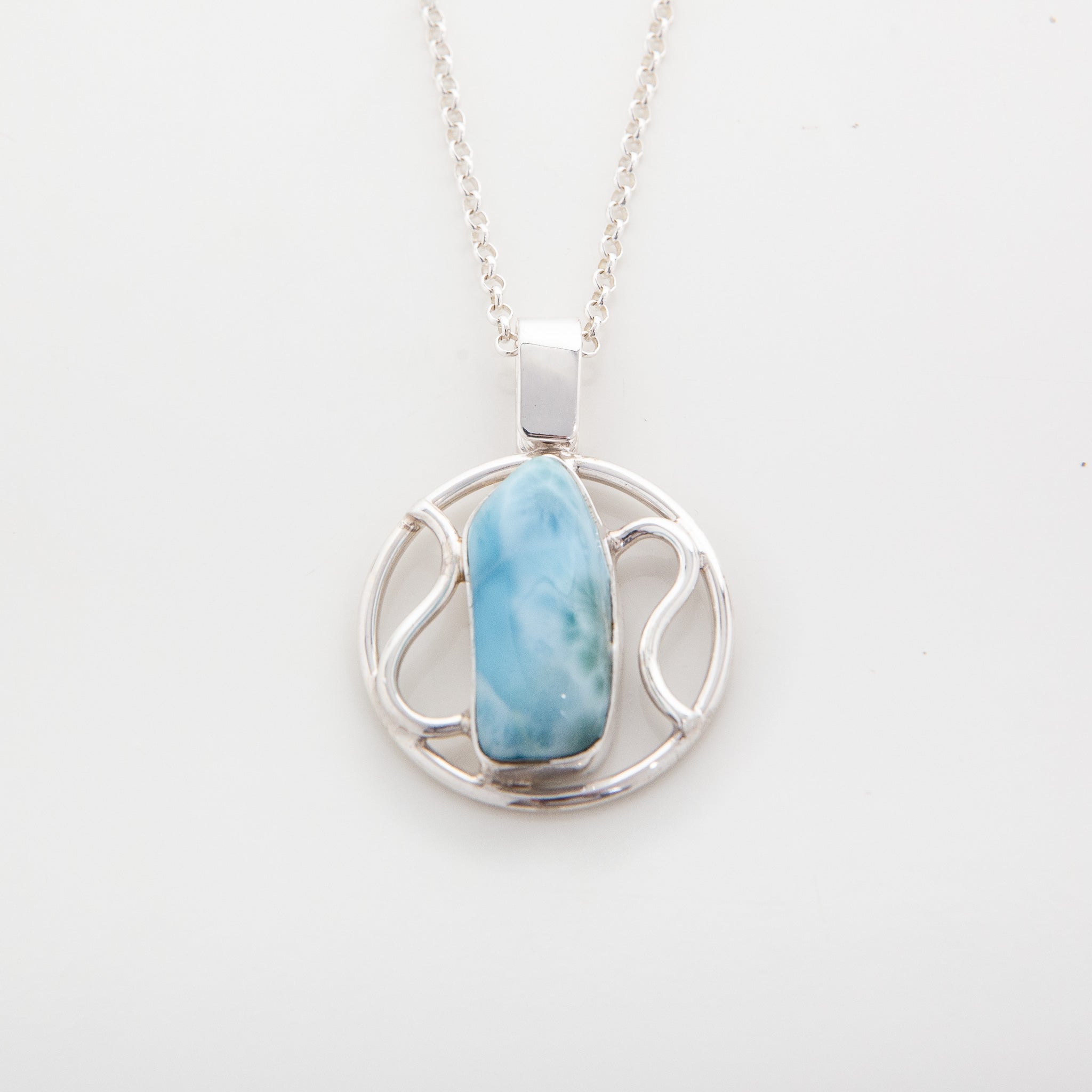 Meet the one-of-a-kind Larimar Pendant Bloom! This handmade pendant features a unique Larimar stone surrounded in silver curved string. Perfect for adding a touch of elegance and individuality to any outfit.