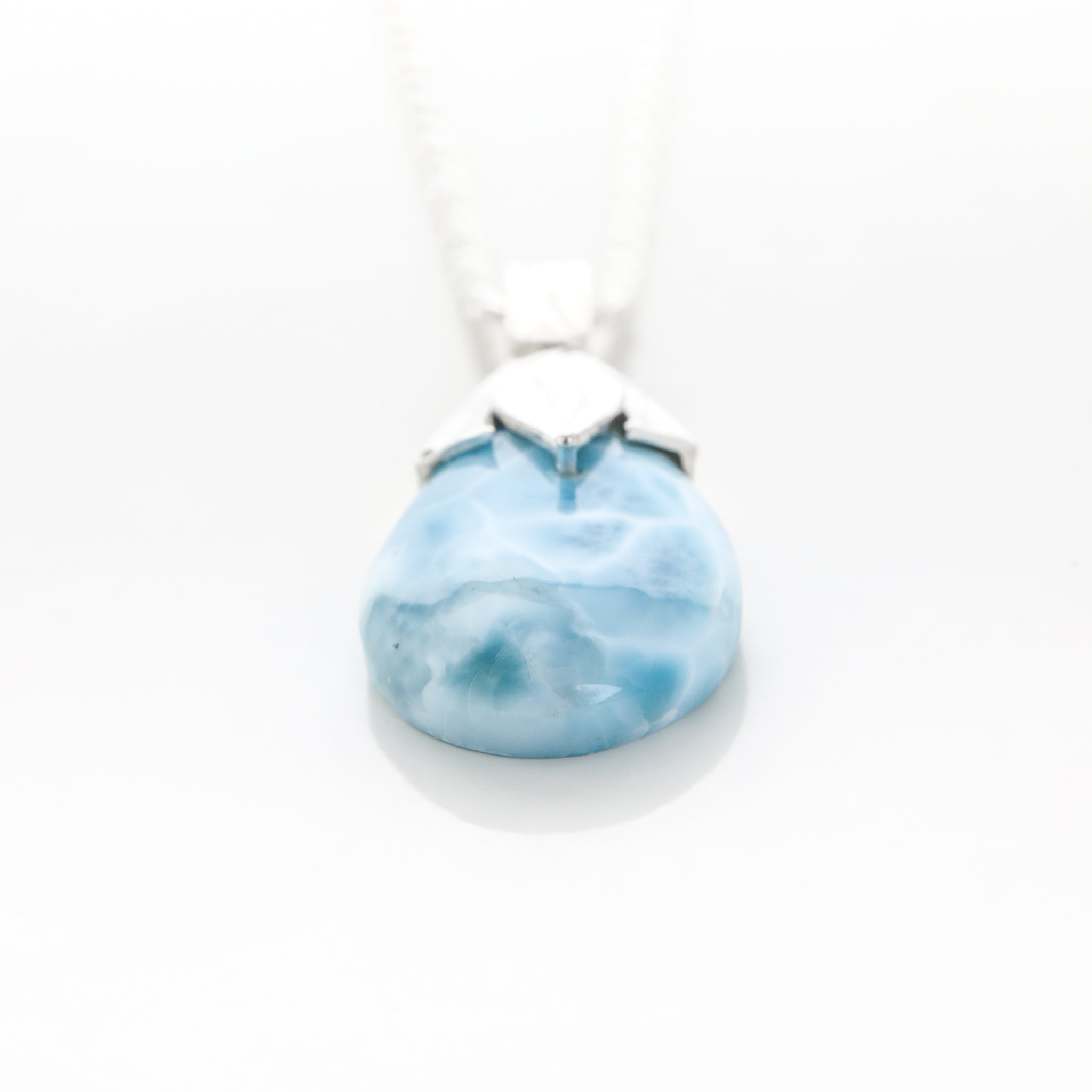 Our jewelry is made with top quality Larimar stone brought directly from the mines, to our workshop, where young, native artisans cut, shape, polish and mount this semi-precious gem in 925 silver or 14K gold bezel cups.