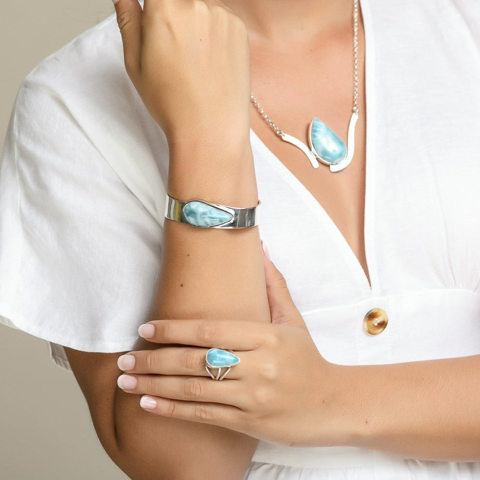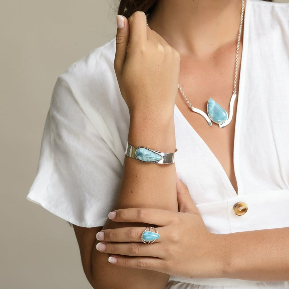 Our inspiration comes in blue hues, from the rareness of the Larimar stone and its unique-bold patterns.