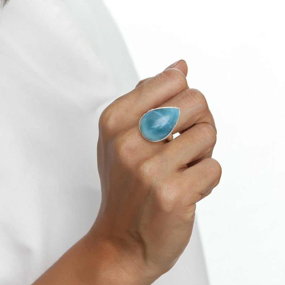 Meet one of our traditional teardrop styles, Avani. With a gorgeous baby blue Larimar stone that sits perfectly in its base. These rings are very comfortable to wear, making your everyday outfit pop out with a blue hint!
