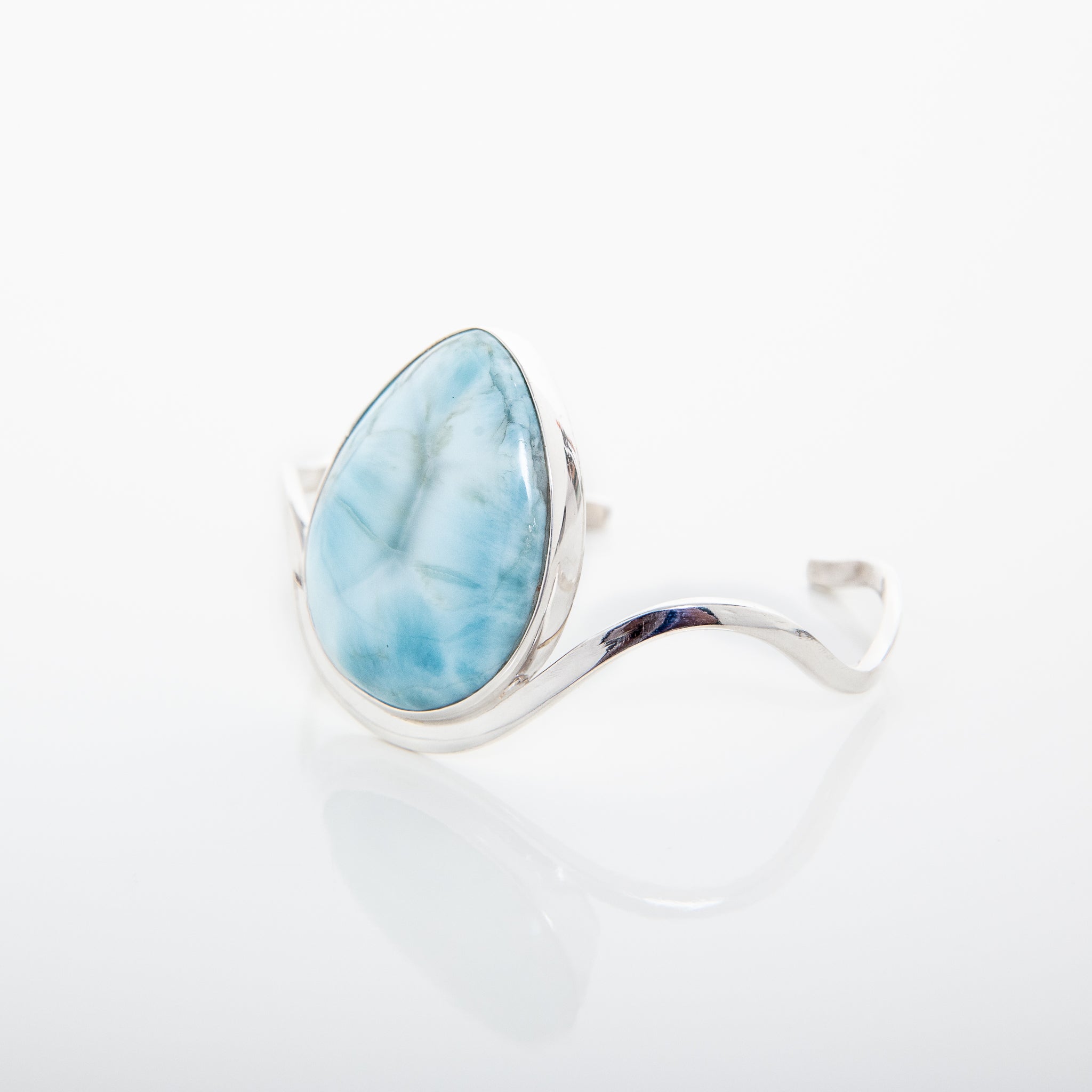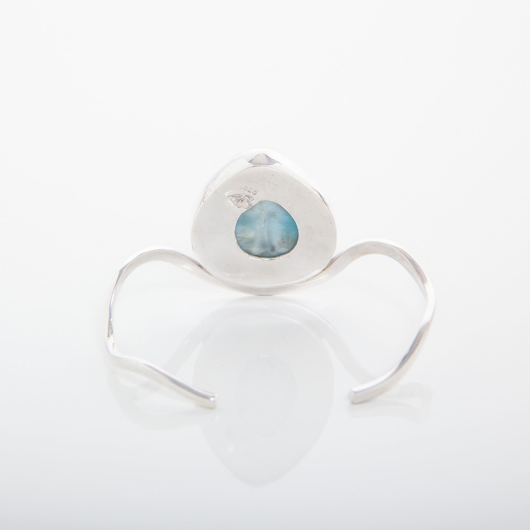 Introduce a touch of whimsy with the Cuff Bracelet Yindra. This unique piece features a bold larimar stone in a delicate light blue hue, complemented by dainty silver work on the cuff. Add a subtle pop of color and elegance to any outfit with this playful accessory.