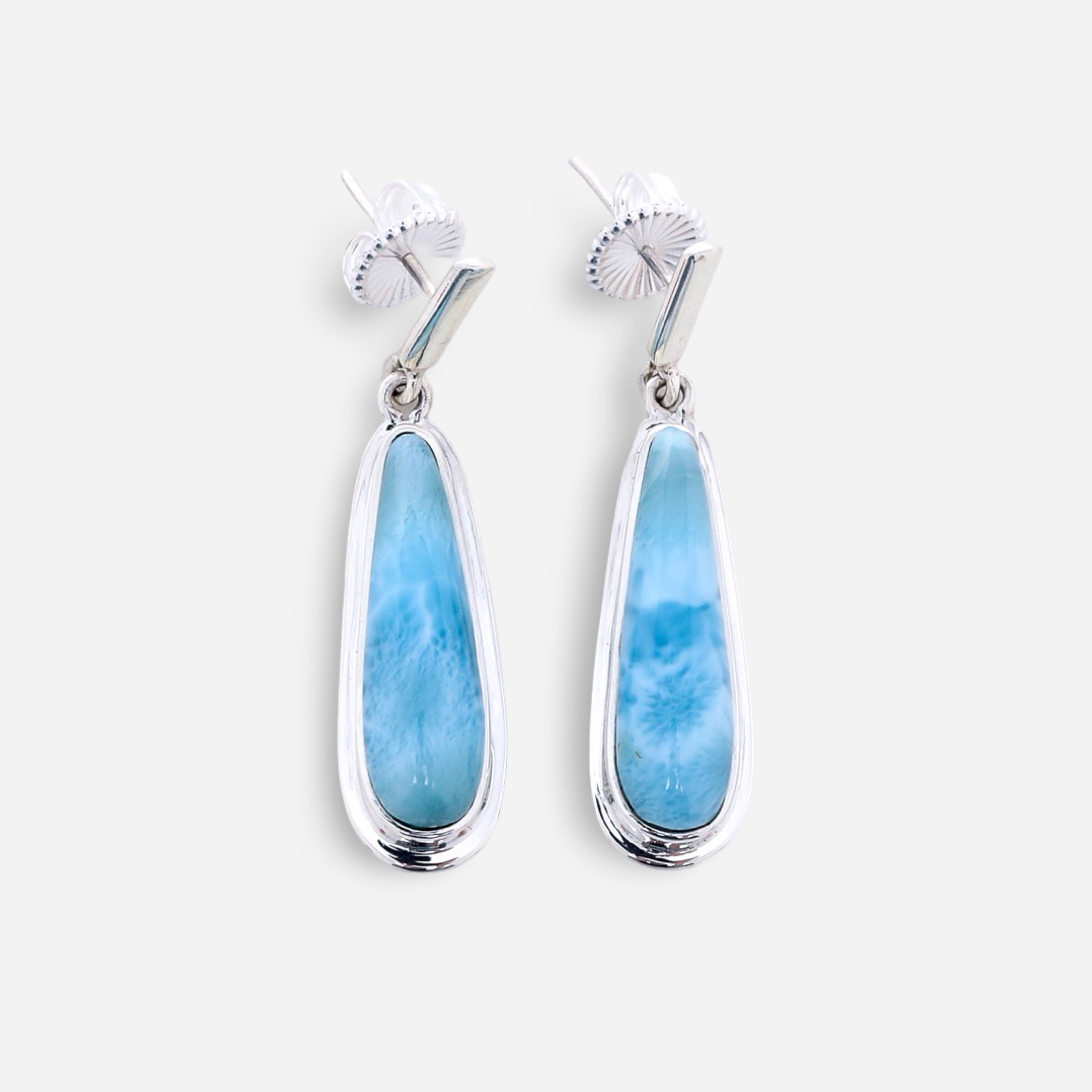 The Larimar Earrings Greta, these teardrop shaped Larimar earrings will add a touch of elegance to any outfit. Made with authentic Larimar Stones, these earrings are perfect for any special occasion. Don't miss out on the stunning combination of style and beauty that Greta has to offer.