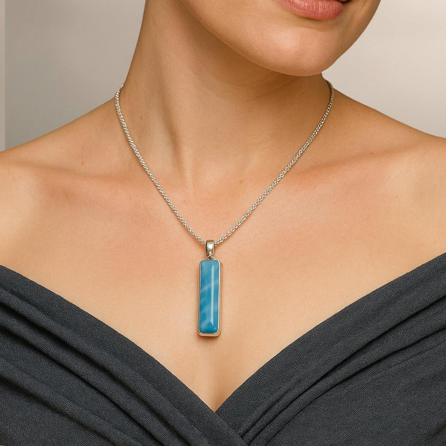 The Larimar Pendant Cecilia features a striking rectangular Larimar Stone set in 925 Silver. This sophisticated design highlights the stone’s natural calming blue tones, offering a refined accessory that adds elegance and a serene touch to any outfit.