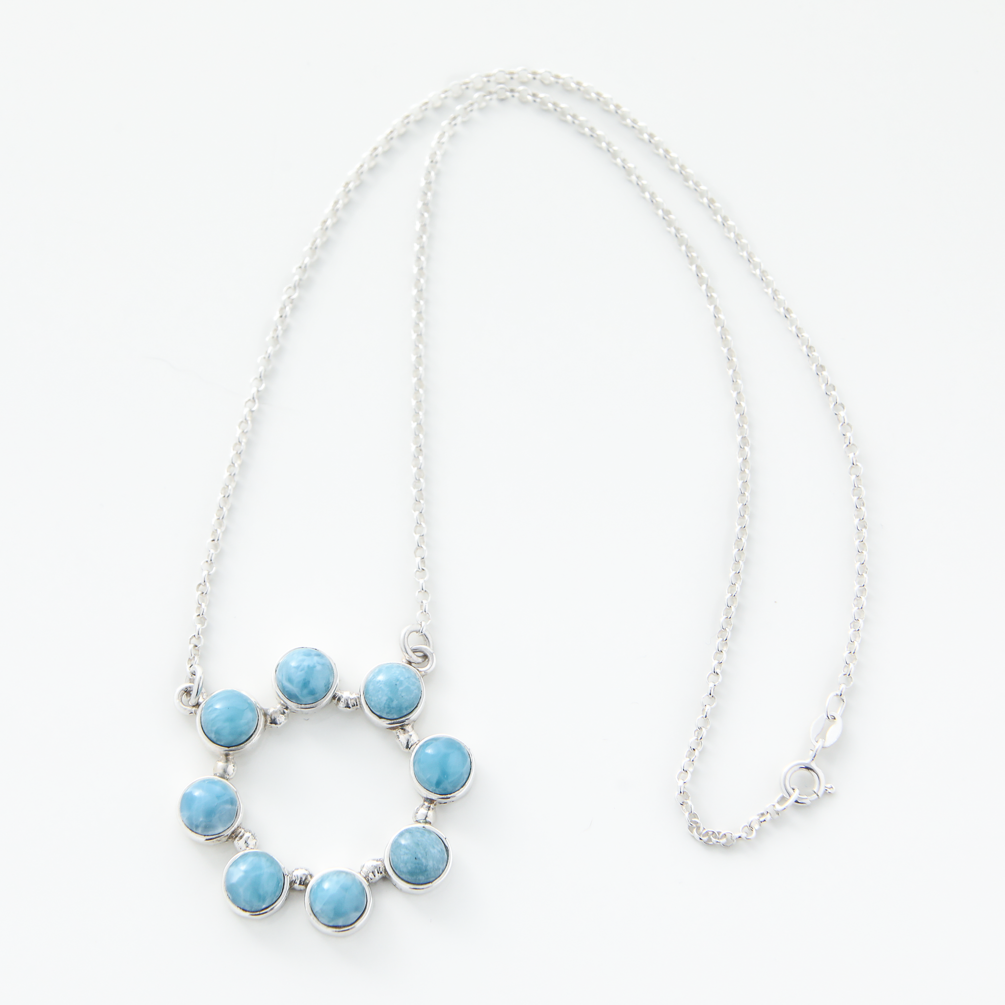 Our jewelry is made with top quality Larimar stone brought directly from the mines, to our workshop, where young, native artisans cut, shape, polish and mount this semi-precious gem in 925 silver or 14K gold bezel cups.