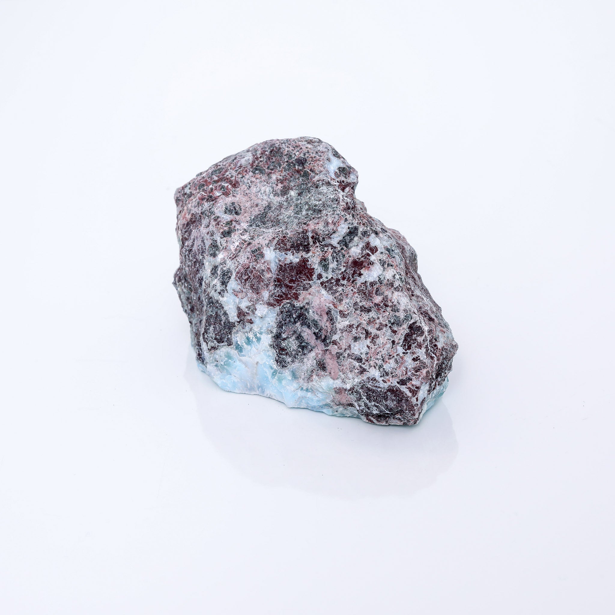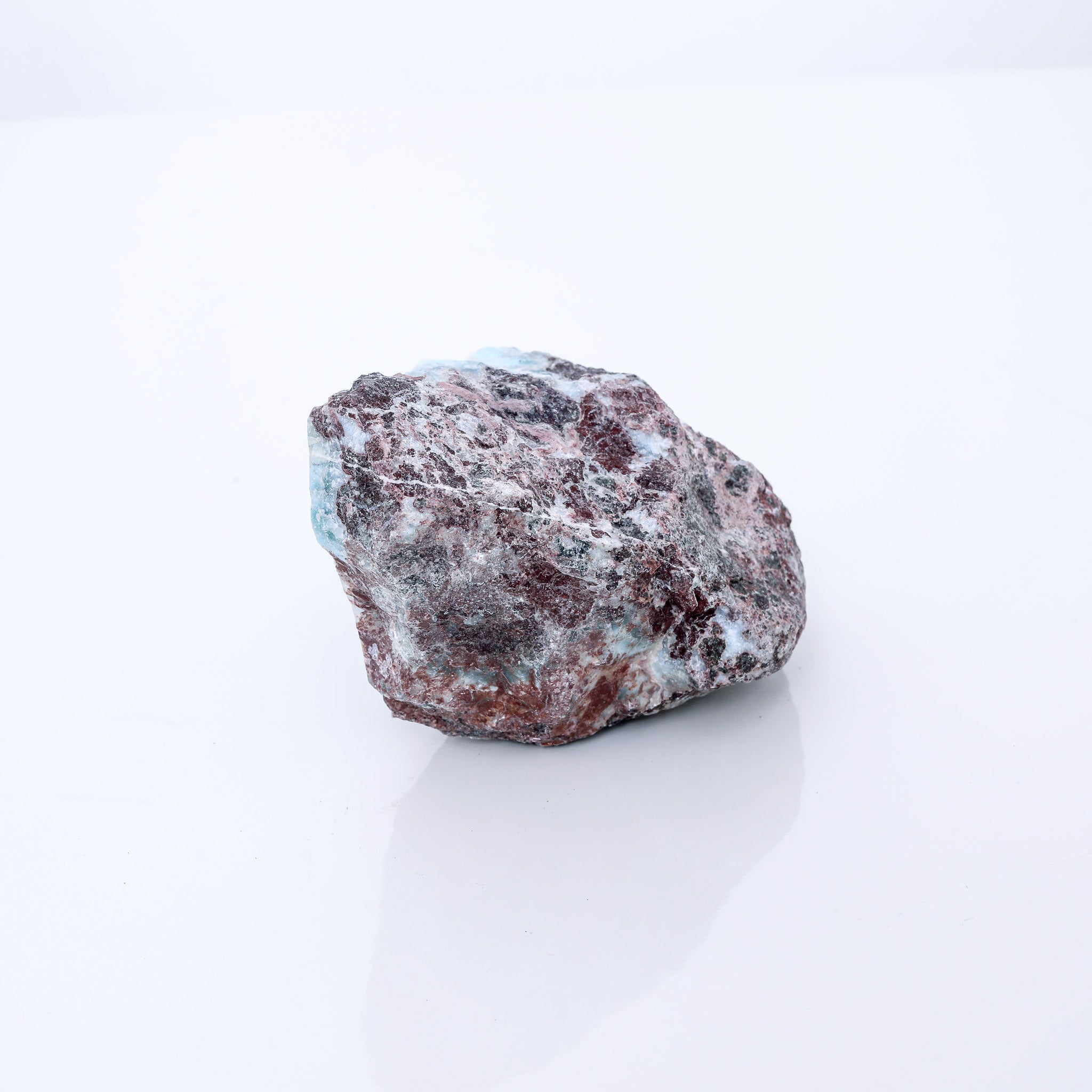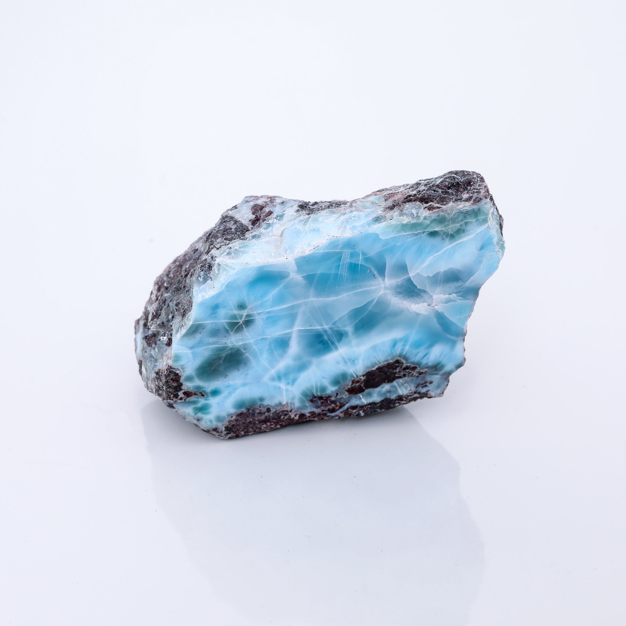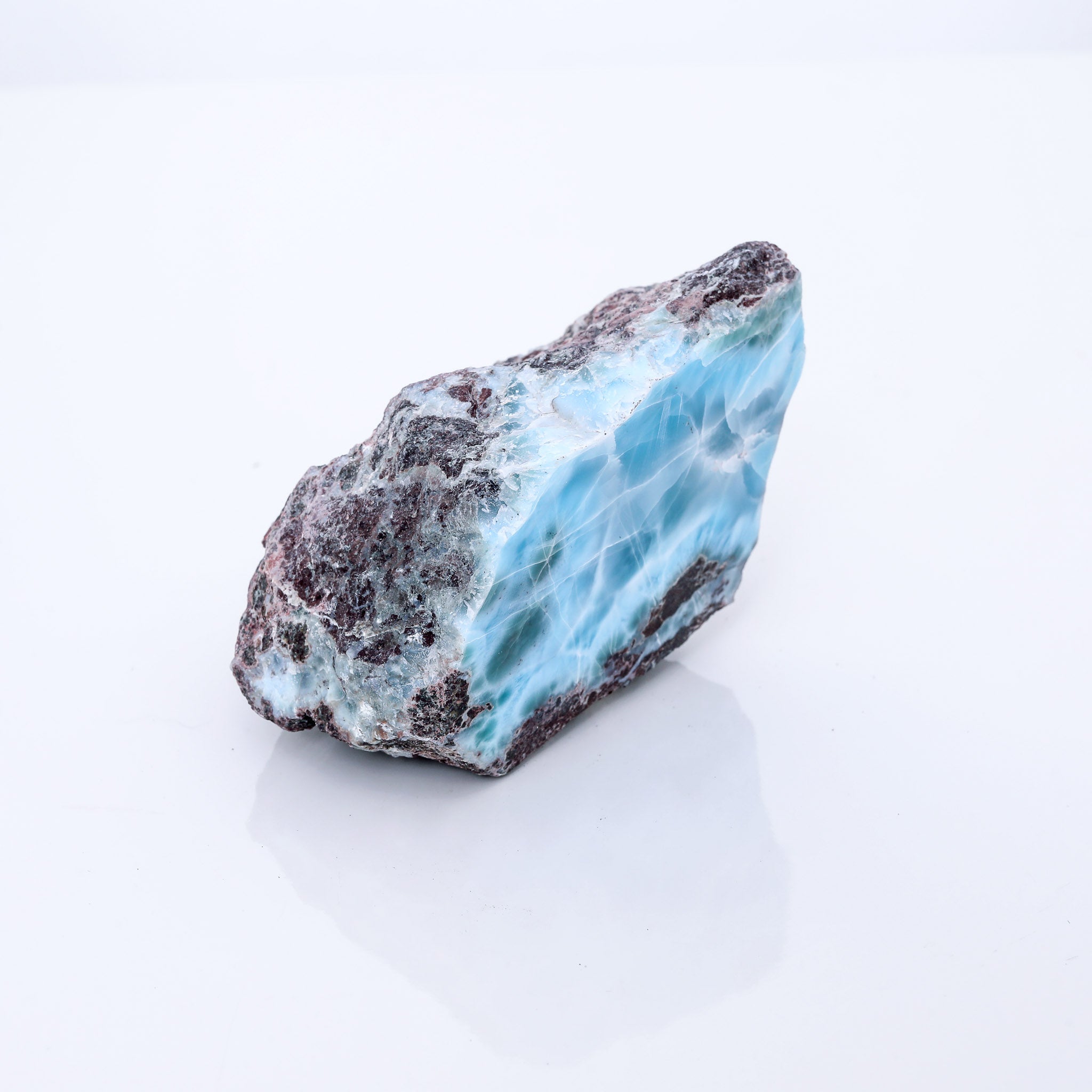 This elegant Larimar stone is polished on one side and rough on the sides, reminiscent of a gentle breeze. Ideal for rock shows, decoration, or as a unique paperweight.