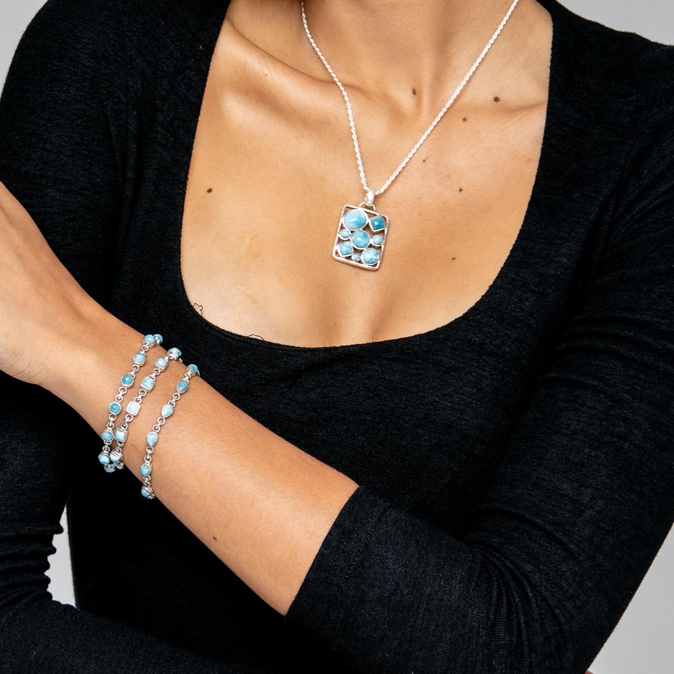 Introducing our Celestial Fusion Collection—a captivating ensemble of Larimar pendants and bracelets. Discover the harmonious blend of multiple shapes, reminiscent of constellations, crafted into stunning pieces that evoke the beauty of the cosmos and celebrate individuality.