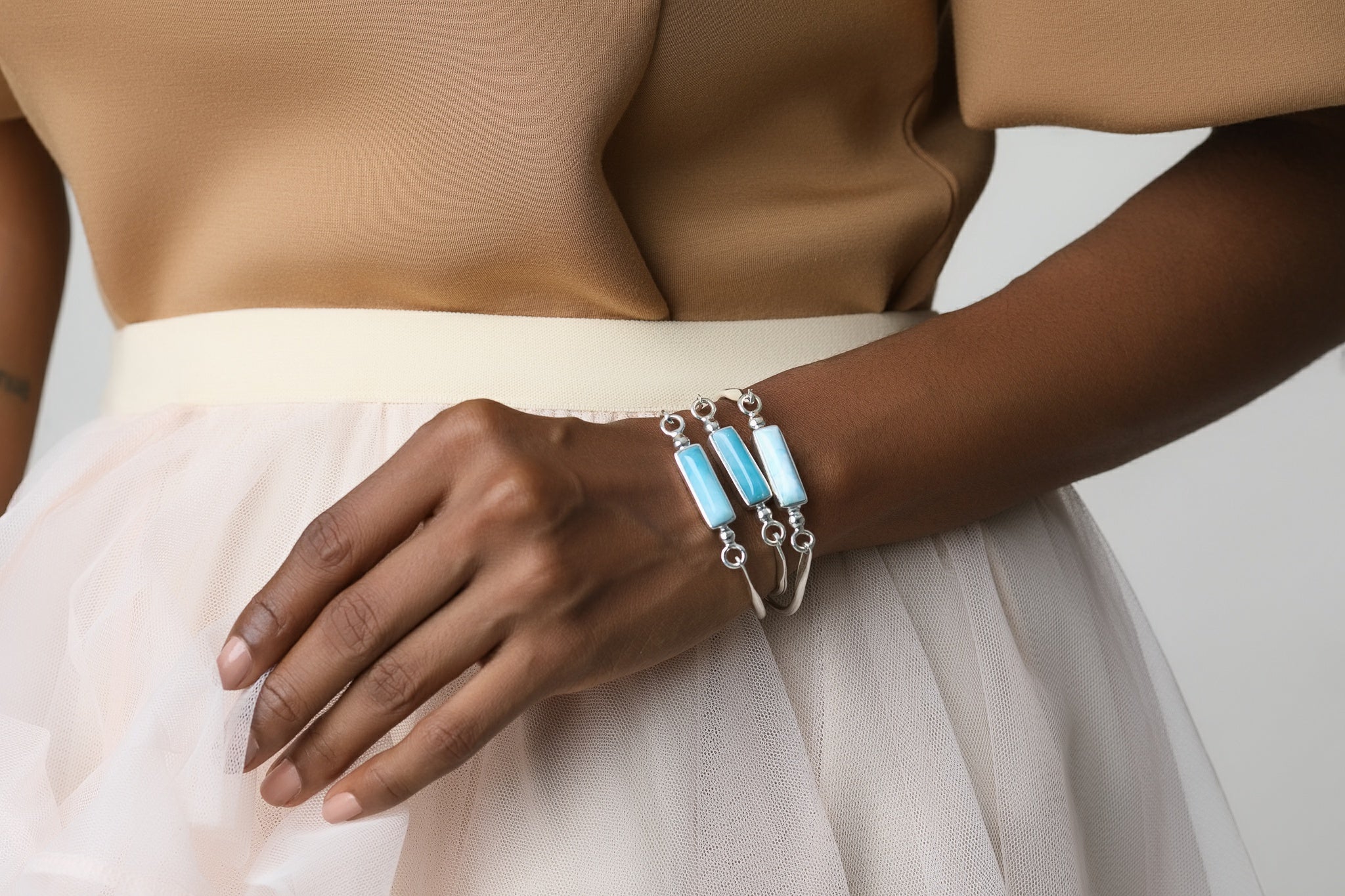 Larimar cuff bracelets offer ample room for adjustment. Your skin shouldn't get clutched between its ends. Also, it shouldn't roll all over the arm just a little below your wrist bone; that's it. As to Larimar chain bracelets, you should be able to fit in or slip two fingers comfortably between the bracelet and the skin.