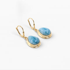 A Larimar specimen stone is a stone where the Larimar has developed in different blue and blue green shades, mixed with other materials or inclusions such as hematite or red dendrites (like these earrings), white calcite, natrolite, fossilized wood, copper, etc. creating gorgeous, fabulous, nature designs. Every Larimar specimen stone is unique!