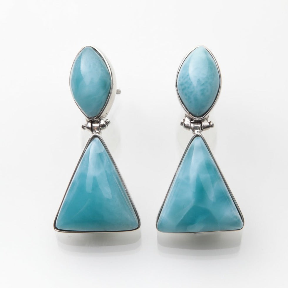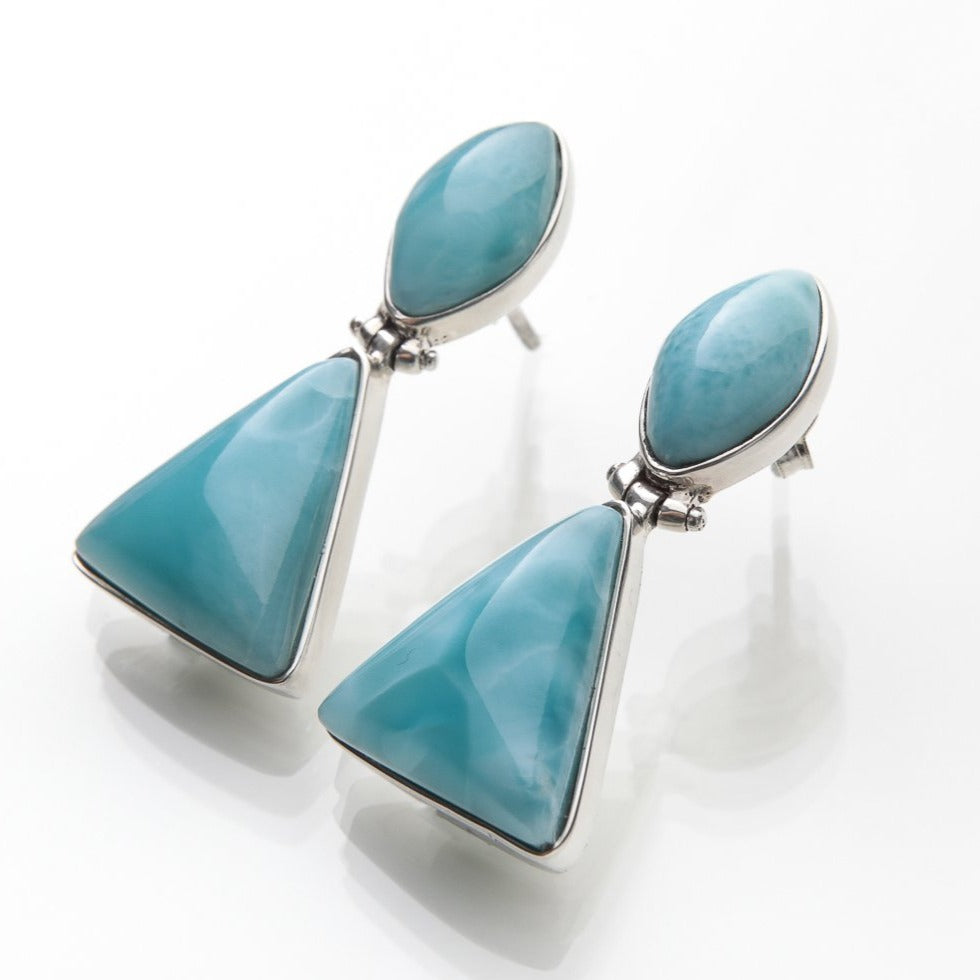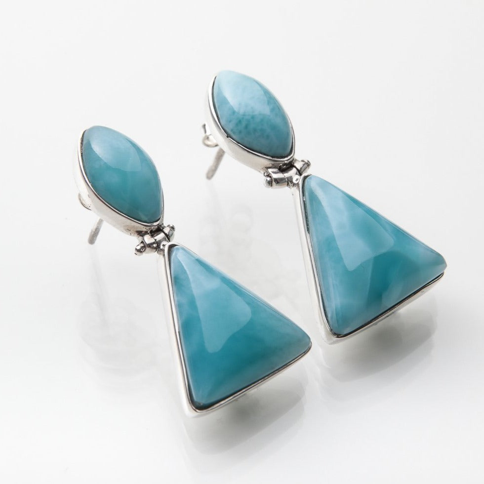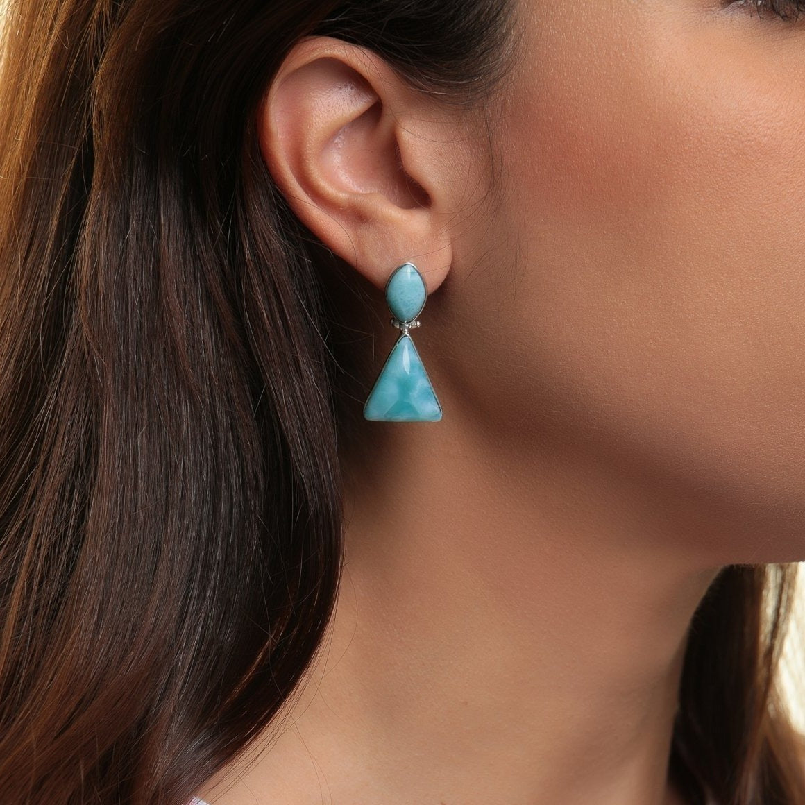 Gorgeous Edaline Larimar earrings with Caribbean stones and a charming swing - a must-have for any occasion! Its triangle and rhombus design adds an intriguing touch. Simply stunning!