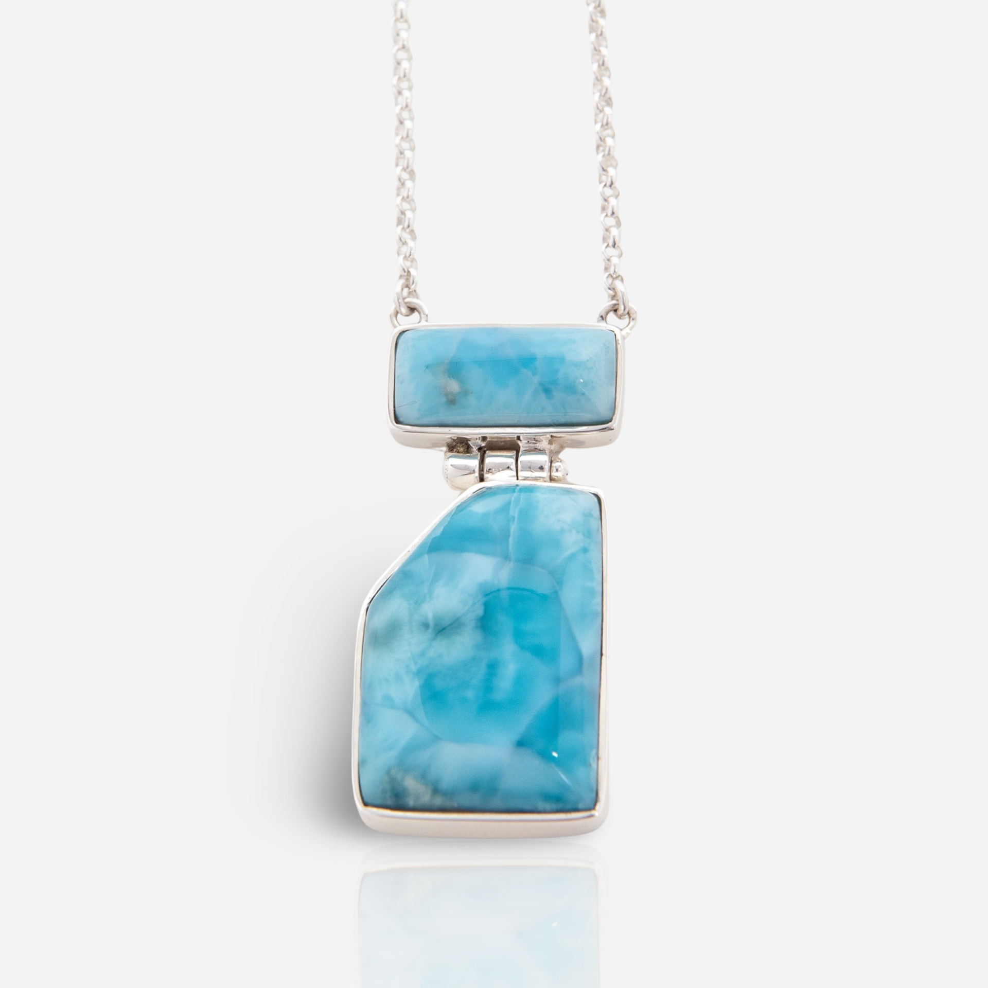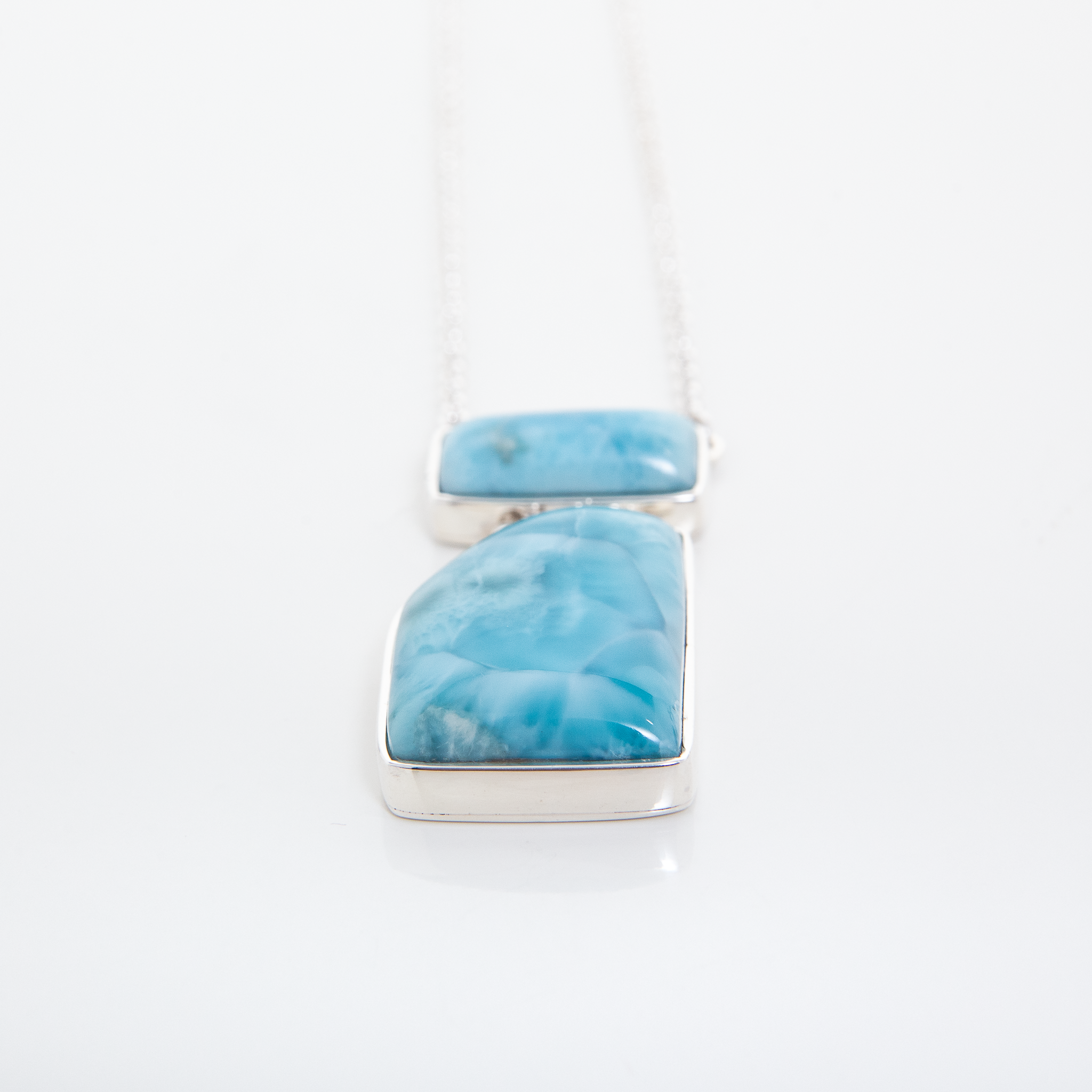 Our jewelry is made with top quality Larimar stone brought directly from the mines, to our workshop, where young, native artisans cut, shape, polish and mount this semi-precious gem in 925 silver or 14K gold bezel cups.