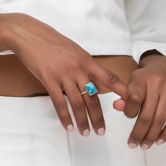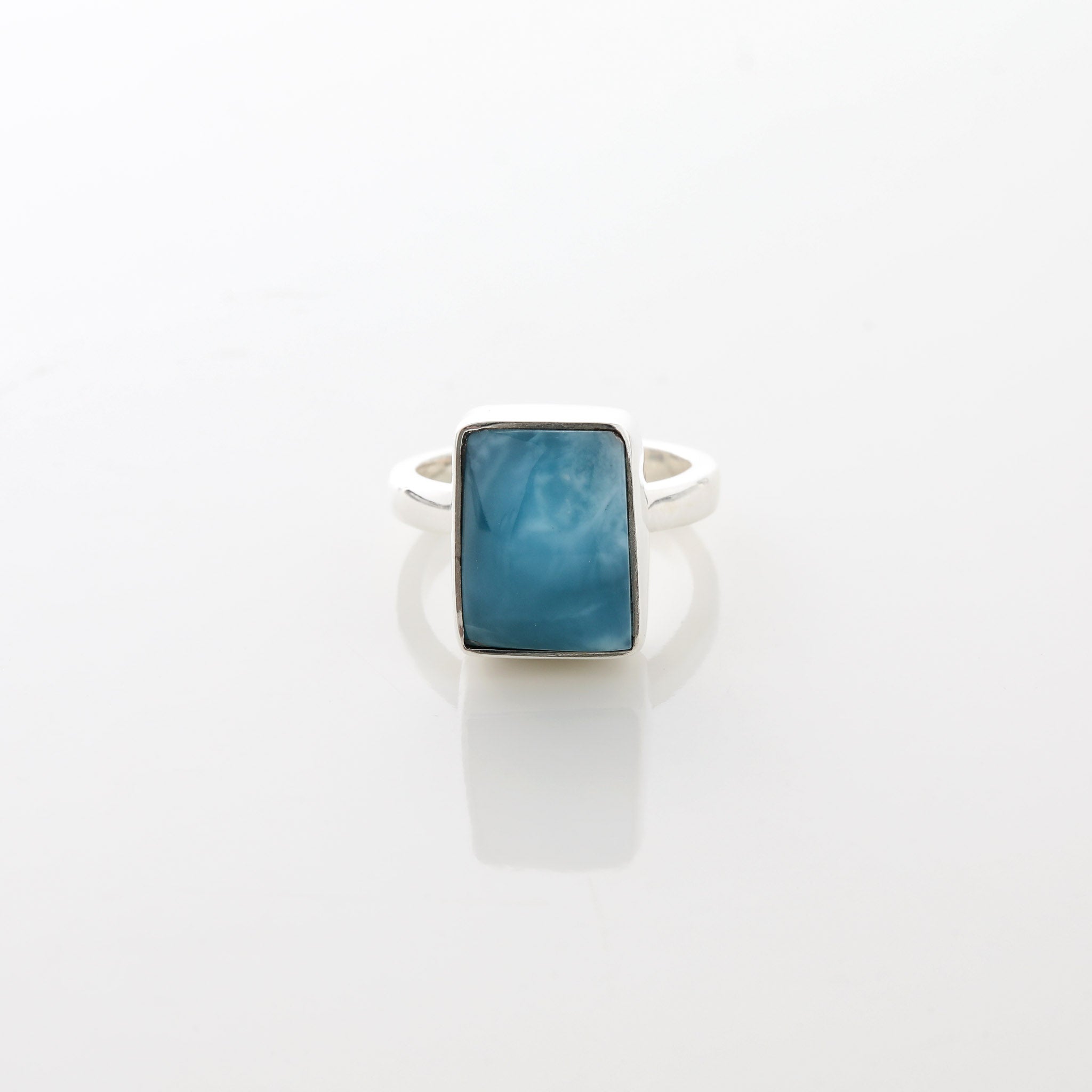 The Larimar Stone Ring Poundcake, named for its delightful triangular shape, this ring is a sweet treat of natural beauty, with the soothing blue of Larimar Stone as its centerpiece.